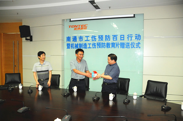 7月29日上午,南通市工伤预防百日行动暨机械制造工伤预防教育片赠送仪式在南通科技报告厅举行,拉开了南通市人社局“工伤预防百日行动”的序幕。参加赠送仪式的有工伤保险中心主任、协会秘书长王泰山,南通科技董事长王建华、总经理沈春华以及公司各级安全管理人员。