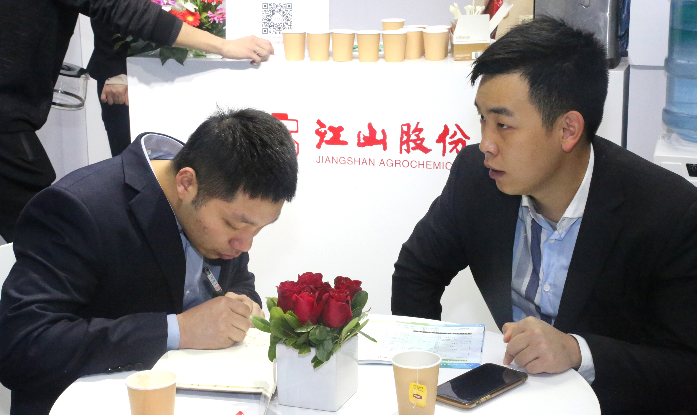 此次江山股份参展的产品有除草剂、杀虫剂、杀菌剂、新材料四大类30多个品种,公司展位吸引了多个国家和地区的专业客户的目光,他们纷纷前来洽谈咨询,寻求合作商机。公司外贸部的工作人员热情地接待前来咨询洽谈的客户朋友,并细致耐心地讲解产品和使用技术,许多客商现场达成初步合作意向。