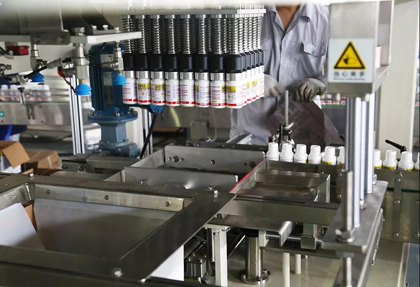 江山股份的制剂包装经历了从手工包装(一条线20人,产能6000瓶/小时),到半自动化(一条线12人,产能10000瓶/小时),再到如今的全自动化(一条线4-6人,产能10000+瓶/小时)。整条生产现联锁控制,输送控制系统运行通畅,提高了生产可控性,包装生产品质好、耗损低。整线智能生产线拥有检查剔除系统,及时自动地实行数据采集,实时对产线运行状态进行监控分析。