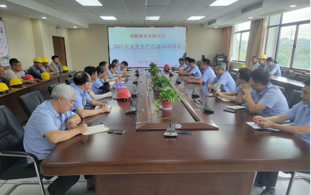 为全面贯彻习近平总书记关于安全生产的重要论述和党中央、国务院关于安全生产重大决策部署,按照《关于产控集团组织开展2021年“安全生产月”活动的通知》文件要求,6月7日下午,南通通粮粮食储备有限公司紧扣“落实安全责任,推动安全发展”这一主题,召开“安全生产月”活动动员会,旨在进一步树牢安全发展理念,强化全员安全责任,推动公司安全生产工作上一个新台阶。全体在岗职工和外包工人参加此次动员会。