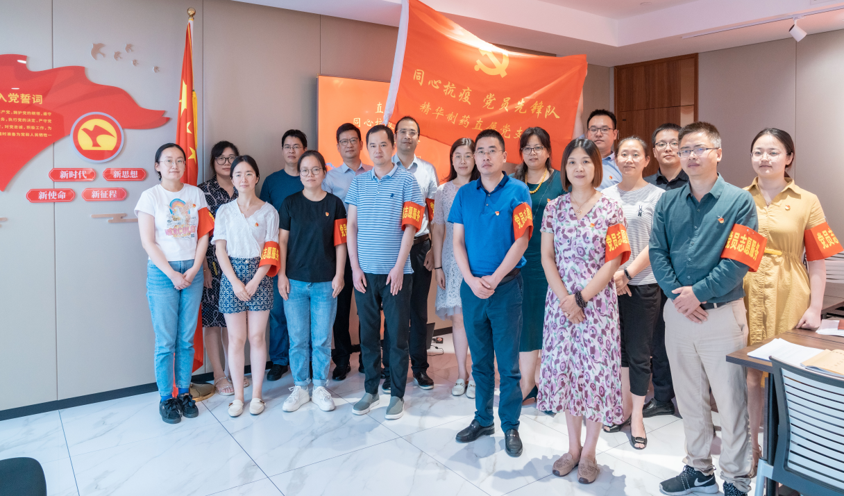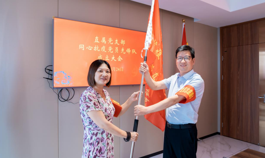 活动上,张建新宣读了产控集团党委《关于开展“两在两同 同心抗疫”志愿服务活动的通知》内容并宣布了“同心抗疫”党员先锋队正式成立。集团党委副书记曹燕红代表集团党委向直属党支部授予“同心抗疫党员先锋队”队旗,并向每一位先锋队员发放了“党员志愿服务”红袖套。随后,张建新带领全体党员先锋队员面对党旗、高举右手,重温了入党誓词。