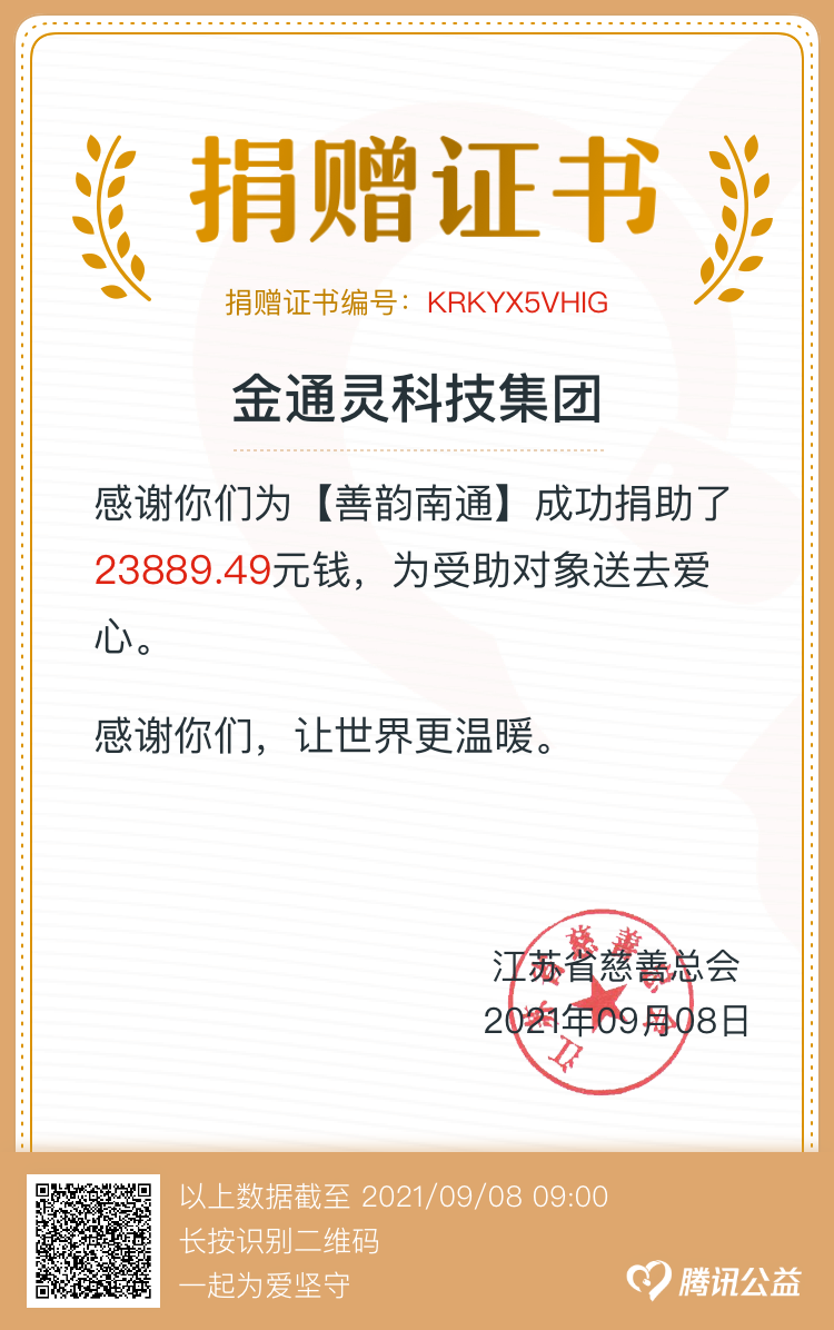 近日,我市组织开展“博爱在南通 慈善暖江海”慈善一日捐活动,金通灵积极响应产控集团的号召,第一时间组织开展一日捐活动。截止到9月8日,金通灵共筹得善款23889.49元,募集资金将统一交至南通市慈善总会,继续用于扶贫、慈善救助项目。