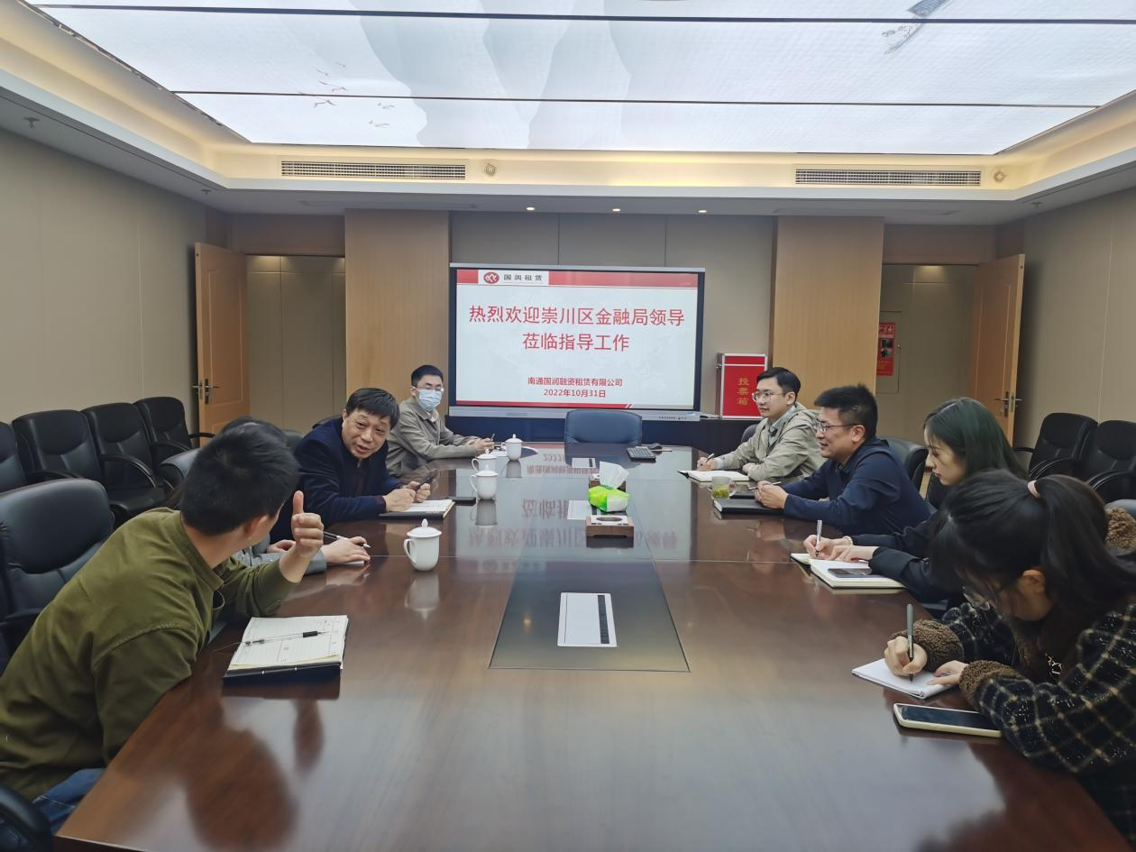 近期,崇川区金融局局长耿拥军、副局长钮卉华等一行四人莅临我司,就南通地区租赁行业及国润公司发展现状开展实地调研。国润租赁党支部书记、董事长陈大鹏和相关部门人员参加调研。