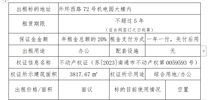 南通国泰创业投资有限公司所托管园区外环西路72号机电园,已由南通三玖企业管理服务有限公司中标负责整体招商运营管理,拟打造成“产业研发、办公及配套商业”的总体格局,即日起公开对外招租。